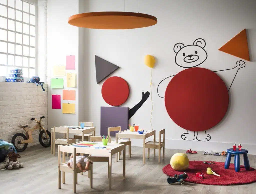 Kinderdagverblijven en scholen zijn plekken vol leven (spel, geroep, gelach) waar het geluidsniveau kan oplopen tot 80 dB, vergelijkbaar met een stofzuiger. Onze akoestische oplossingen (hangende of wandpanelen) dempen deze hinder effectief en bevorderen de rust die nodig is voor slaap en concentratie.